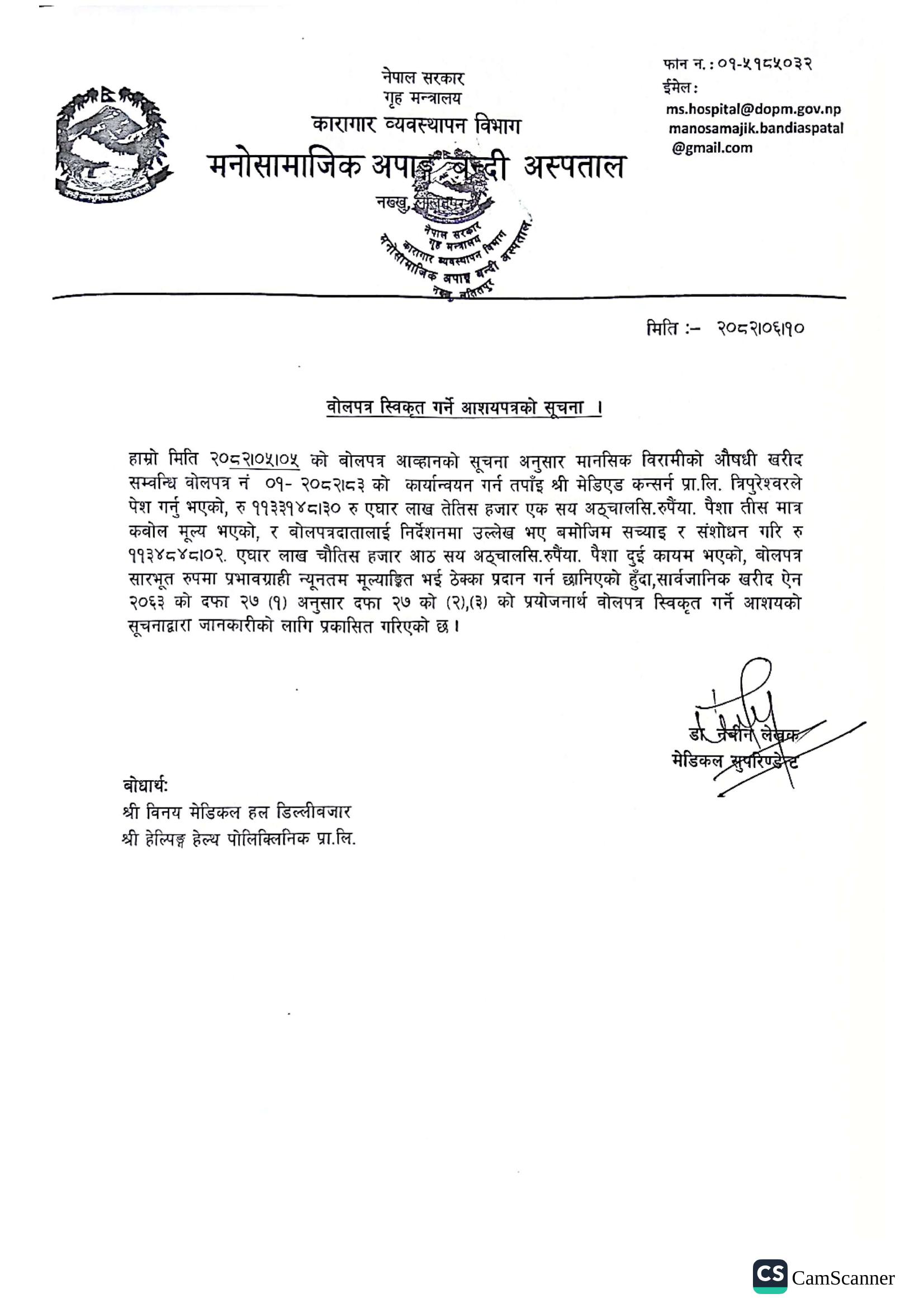 बोलपत्र स्वीकृत गर्ने आशयको सूचना ।
